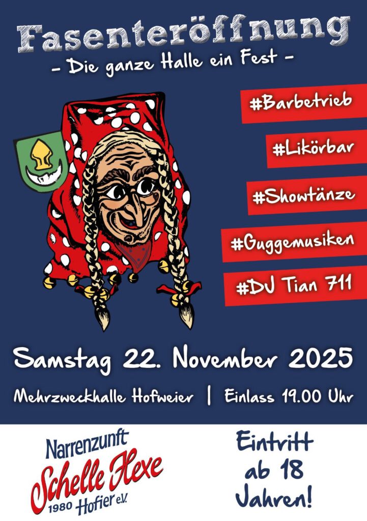 Das Jubiläumswochenende findet vom 20.01.24 – 21.01.24 in Form eines Narrendorfs am Rathausplatz in Hofweier statt. Zusätzlich wird es einen Jubiläumsumzug am Sonntag geben.
